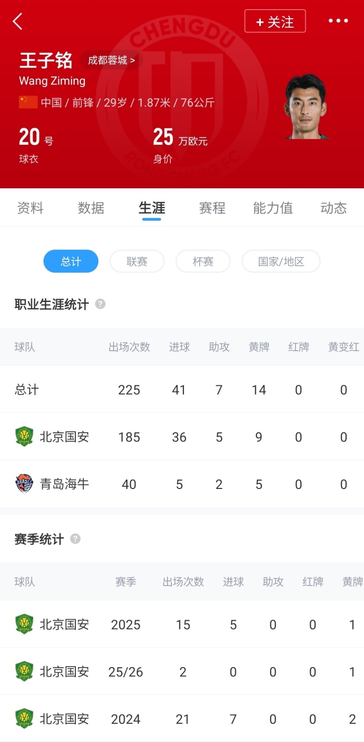 官方:成都蓉城签下29岁北京国安前锋王子铭,上赛季17场5球